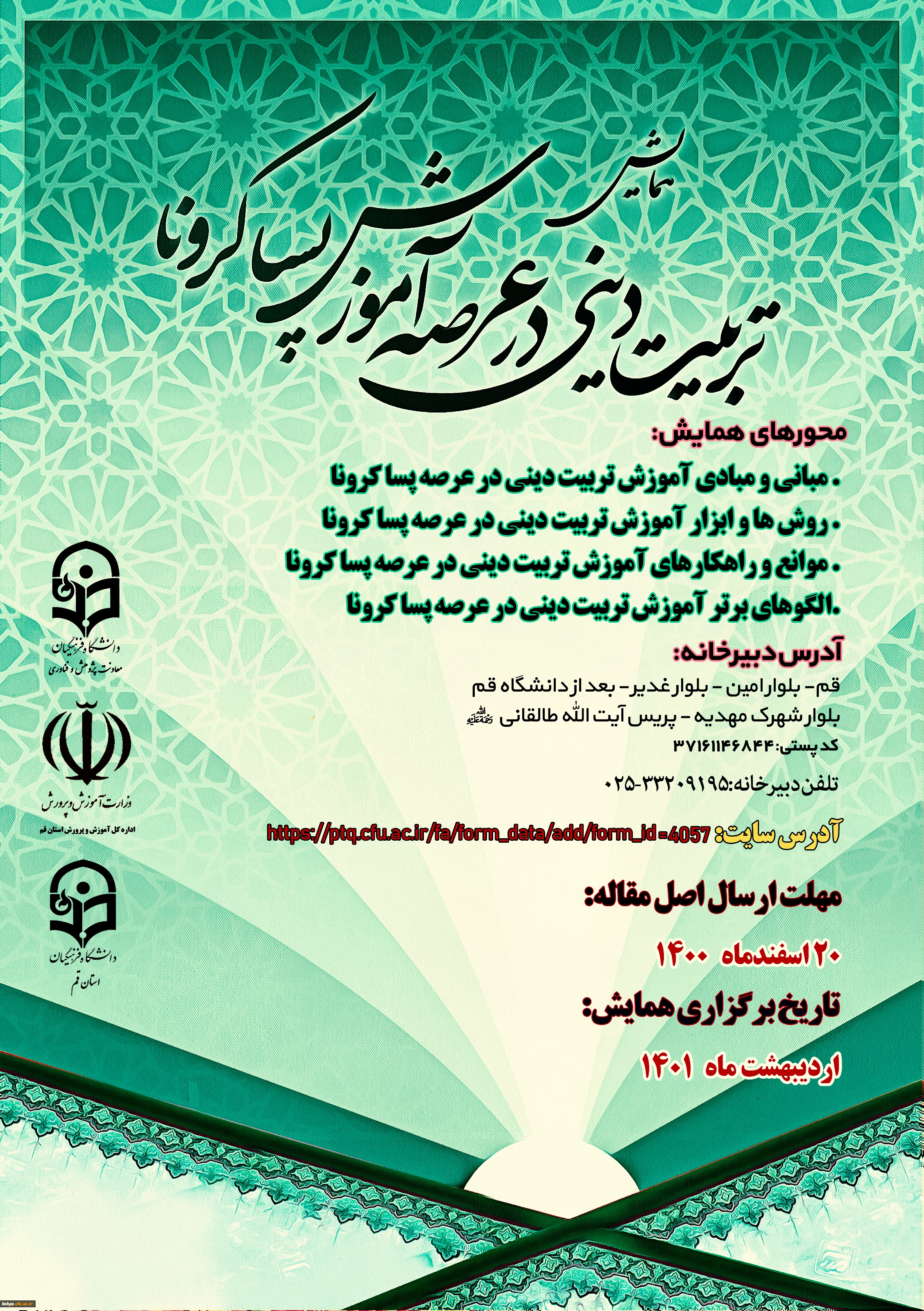 " همایش آموزش تربیتی دینی در عرصه پسا کرونا آدرس سایت همایش: https://ptq.cfu.ac.ir/fa/form_data/add/form_id=4057