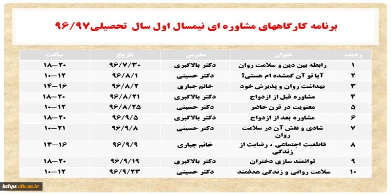 برنامه کارگاه های مشاوره های پردیس شهید صدوقی