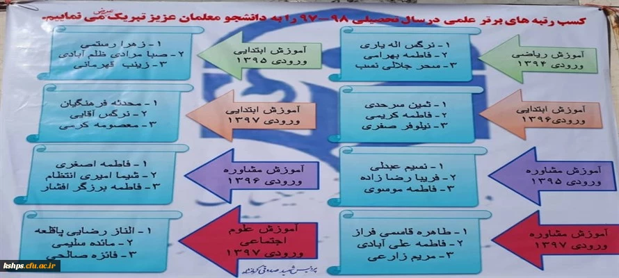 در هفته بزرگداشت مقام معلم در پردیس شهید صدوقی از دانشجویان رتبه های برتر علمی با اهدای لوح سپاس و هدیه تقدیر شد کسب رتبه های برتر تحصیلی را به این دانشجویان کوشا و ساعی تبریک می گوییم و برای سایر دانشجویان گرامی آرزوی توفیق روزافزون داریم. 2