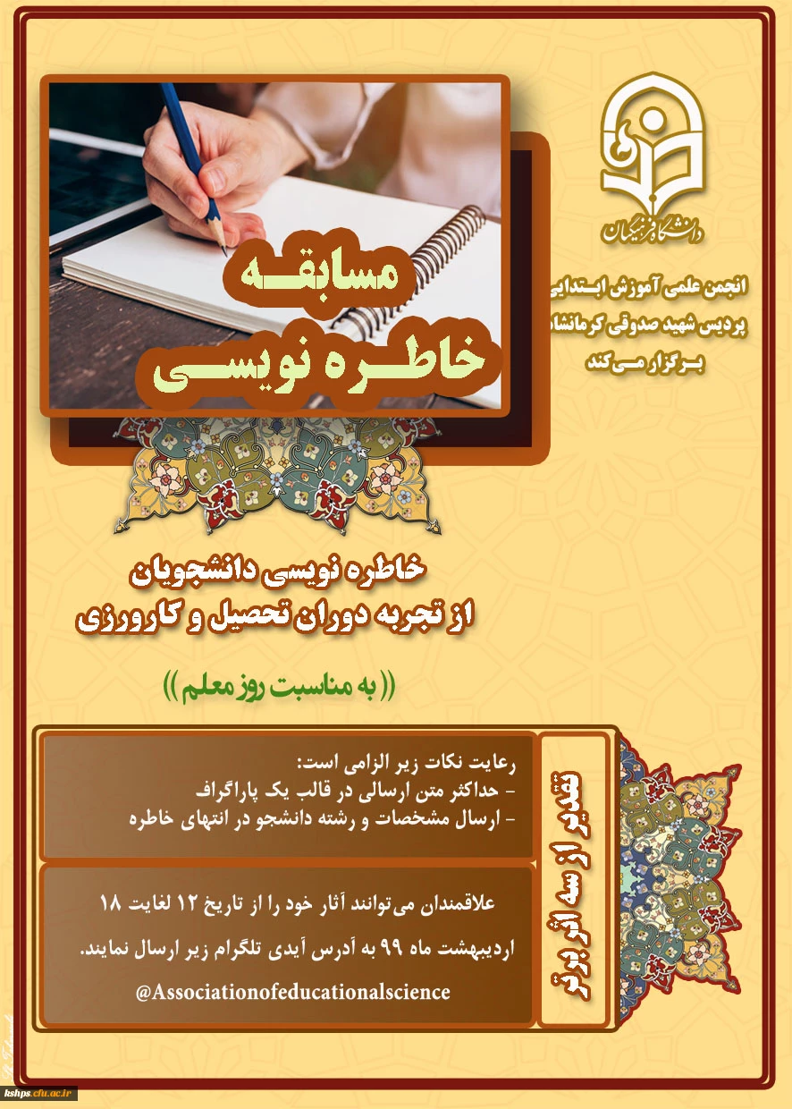 امتیاز دهید : برگزاری مسابقه خاطره نویسی به مناسبت گرامیداشت روز معلم 2 چهارشنبه 17 اردیبهشت 1399 ساعت 11:15