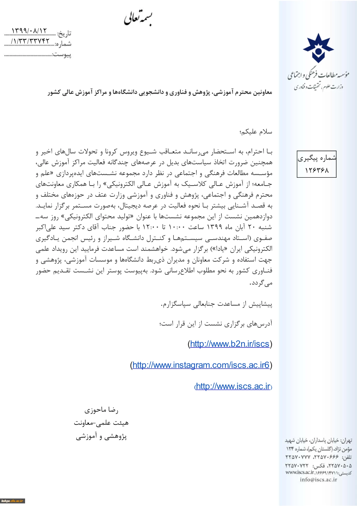 امتیاز دهید : مجموعه نشست های علم و جامعه؛ از آموزش عالی کلاسیک به آموزش عالی الکترونیکی"، 2 یکشنبه 25 آبان 1399 ساعت 8:59