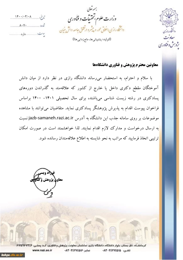 امتیاز دهید : فراخوان " پذیرش پژوهشگر پسادکتری رشته زیست شناسی دانشگاه رازی " 2 یکشنبه 30 خرداد 1400 ساعت 11:08
