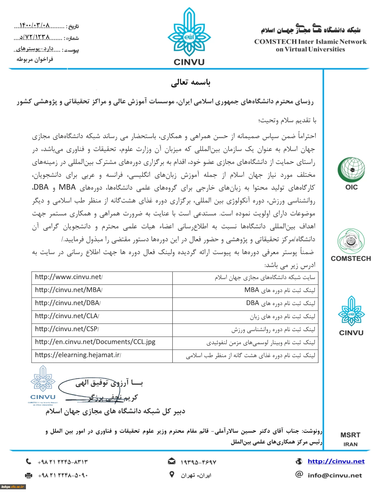 فراخوان " برگزاری دوره های آموزشی مشترک بین المللی توسط شبکه دانشگاههای مجازی جهان اسلام( CINVU )" 2