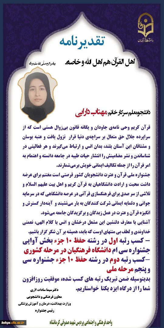 کسب رتبه اول حفظ 10 جزء جشنواره سی و پنجم  قرآنی دانشگاه فرهنگیان (مرحله ملی) توسط دانشجومعلم پردیس شهید صدوقی 2