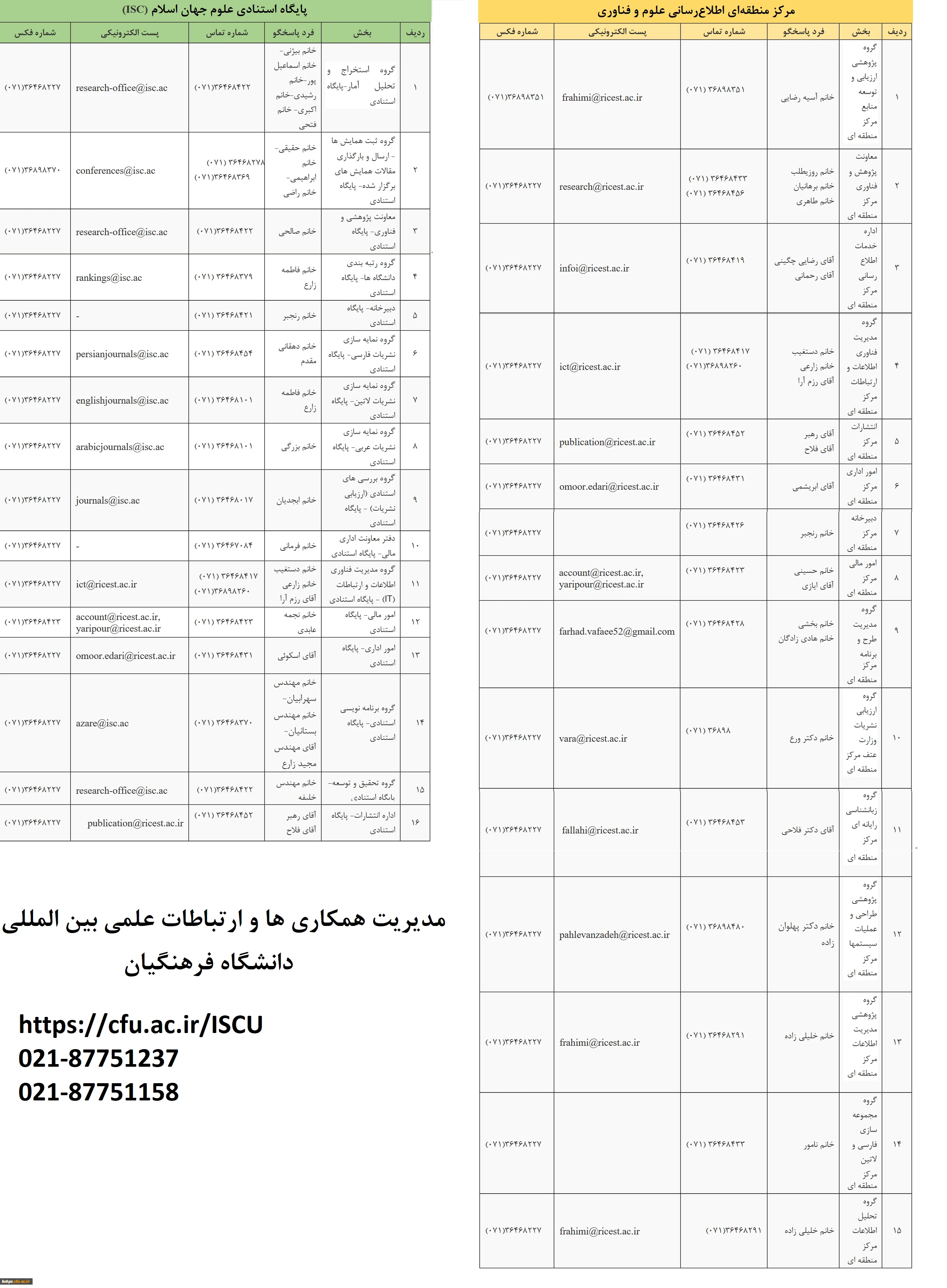 با توجه به طیف گسترده و تنوع بخش ها، پایگاه ها، خدمات و ماموریت های پایگاه استنادی علوم جهان اسلام (ISC) و مرکز منطقه ای اطلاع رسانی علوم و فناوری (RICeST)، به منظور تسهیل ارتباط اعضای هیات علمی، اساتید، دانشجومعلمان و علاقه مندان به پژوهش، مدیریت همکاری