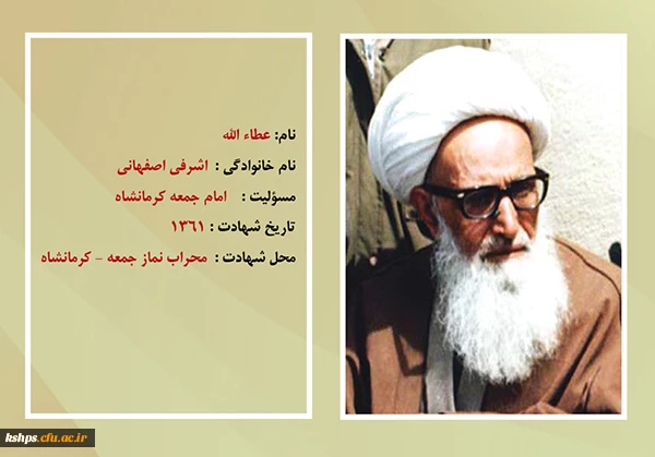 شهید اشرفی اصفهانی در ۲۳ مهرماه ۱۳۶۱ در حال اقامه نماز جمعه در کرمانشاه با انفجار نارنجک توسط سازمان مجاهدین خلق ایران ترور شد و تخت فولاد اصفهان به خاک سپرده شد. 3