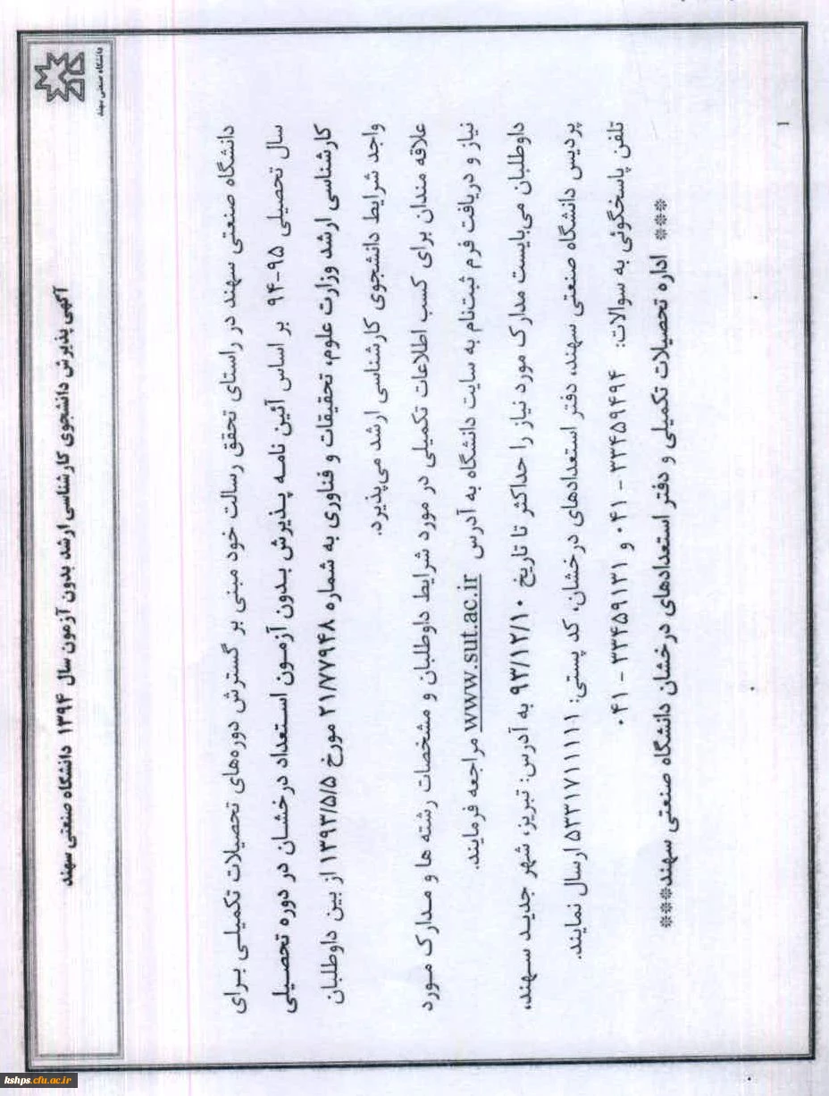 امتیاز دهید : آگهی پذیرش دانشجوی کارشناسی ارشد بدون آزمون سال 1394دانشگاه سهند 2 شنبه 16 اسفند 1393 ساعت 9:33