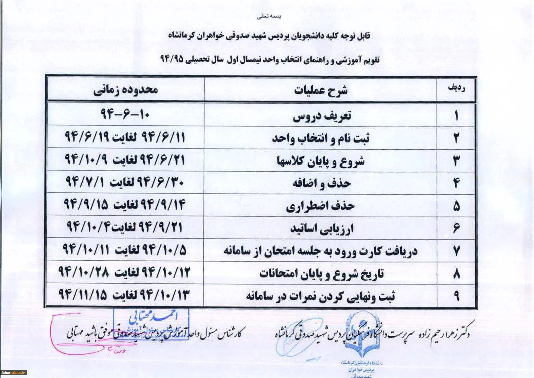 قابل توجه کلیه دانشجویان پردیس شهید صدوقی کرمانشاه برنامه ریزی دروس و انتخاب واحد نیمسال اول 94-95 2